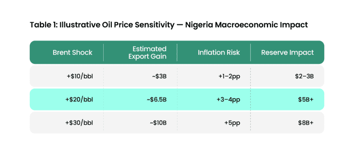 1. Limited escalation scenario: Brent stabilises between $90–$105/bbl, shipping disruptions remain manageable, and Nigeria experiences moderate fiscal gains alongside rising but controllable inflation.