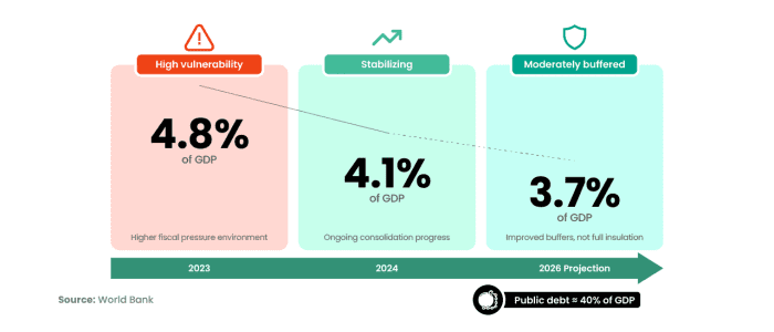 The inflation story had also improved, at least before the latest shock. Nigeria’s headline inflation eased to 15.10% in January 2026, extending a gradual disinflation trend. However, the IMF’s 2025 Article IV mission and the World Bank’s Nigeria macro updates make clear that Nigeria remains fiscally and structurally vulnerable. The consolidated fiscal deficit improved to 4.1% of GDP in 2024 from 4.8% in 2023, while World Bank projections still place Nigeria’s fiscal deficit near 3.7% of GDP in 2026, with public debt around 40% of GDP. That means the country is better buffered than before but not insulated.